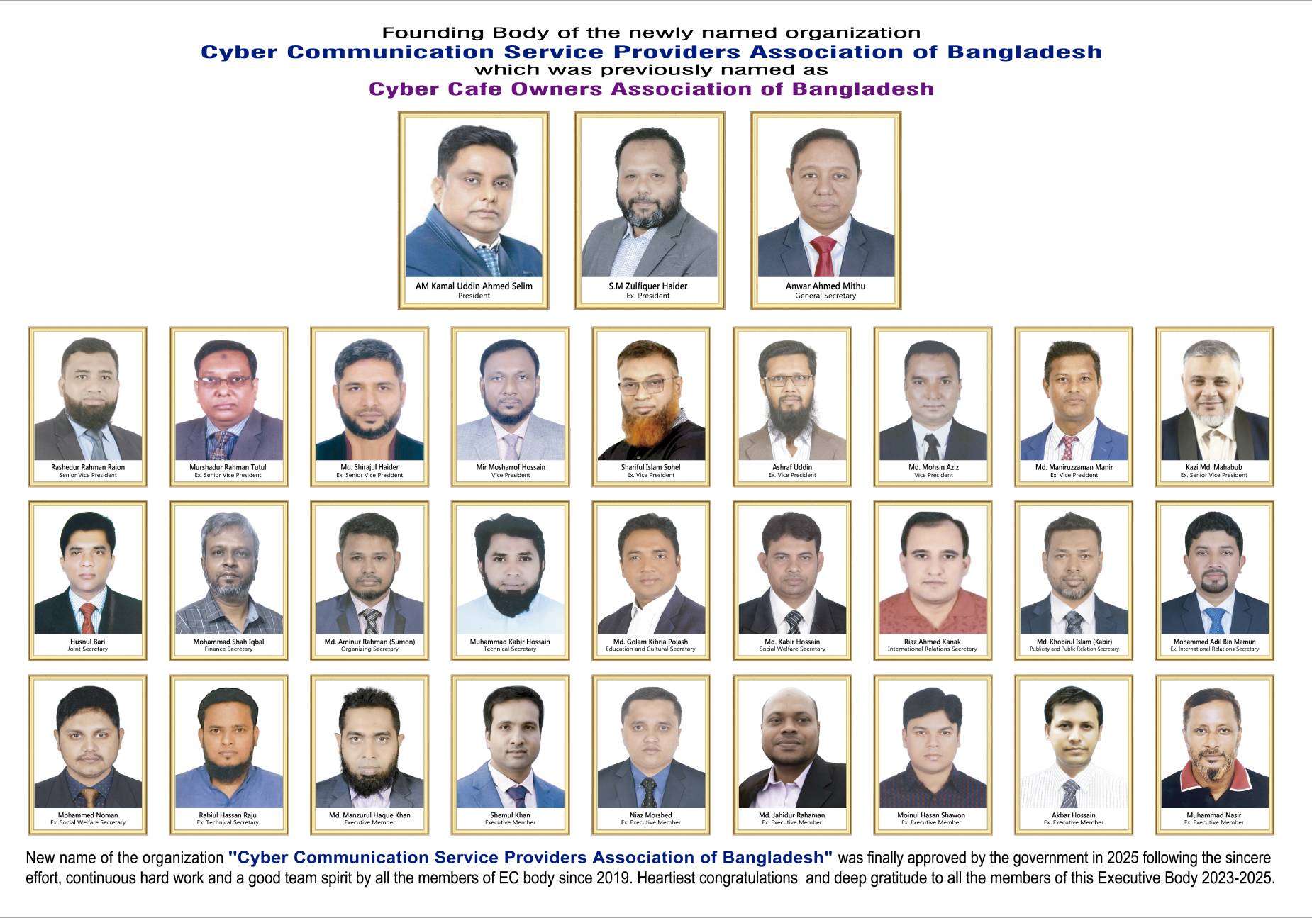 New name of the oragnization ''Cyber Communication Service Providers Association of Bangladesh" was finally approved by the government in 2025 following the sincere effort, continuous hard work and a good team spirit by all the members of EC body since 2019. Heartiest congratulations and deep gratitude to all the members of this Executive Body 2023-2025.